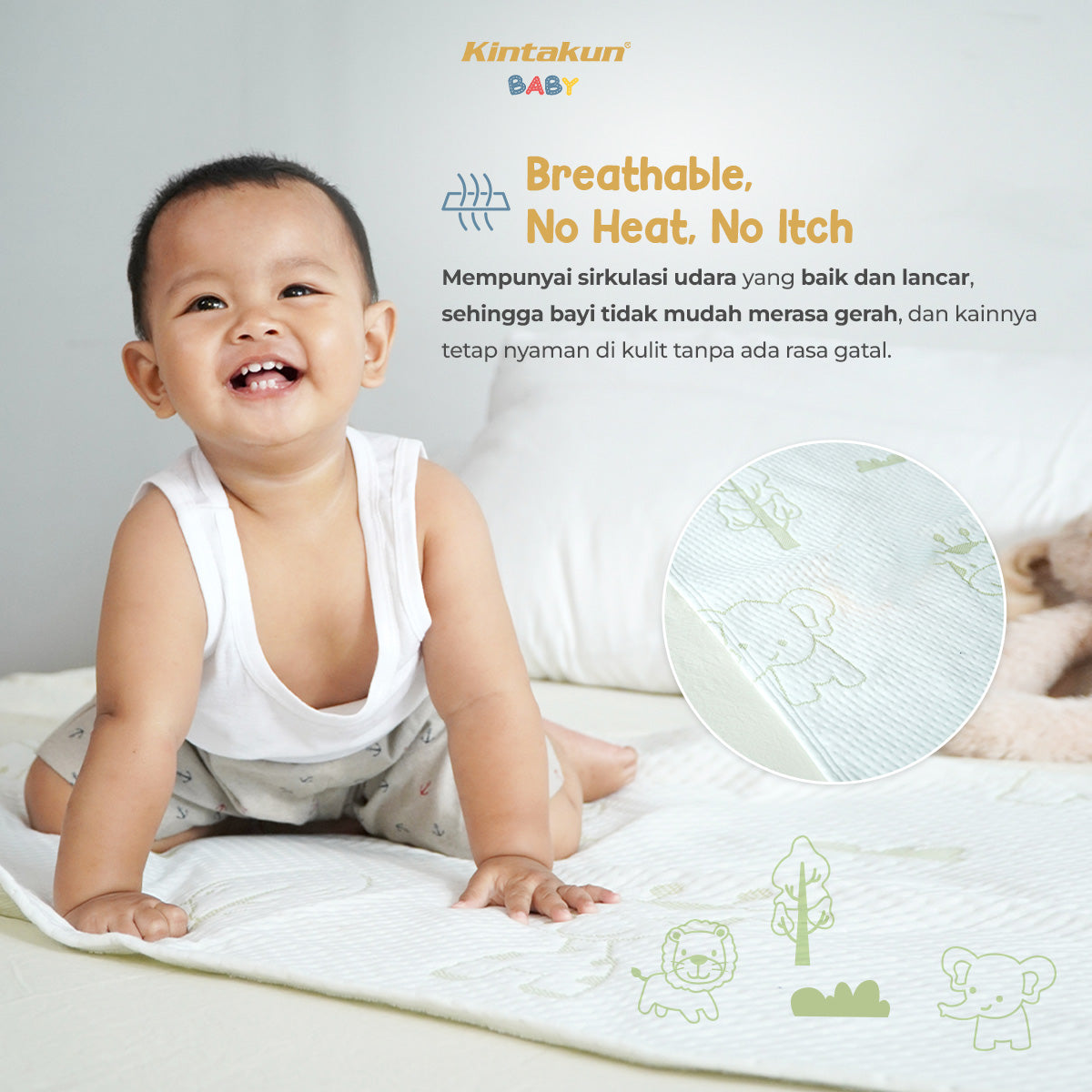 Didesain dengan leak flow control untuk menahan cairan agar tidak menyebar, sehingga lebih mudah dibersihkan dan area sekitar tetap aman. Sirkulasi udaranya baik, tidak panas, tidak gatal, dan nyaman di kulit bayi.